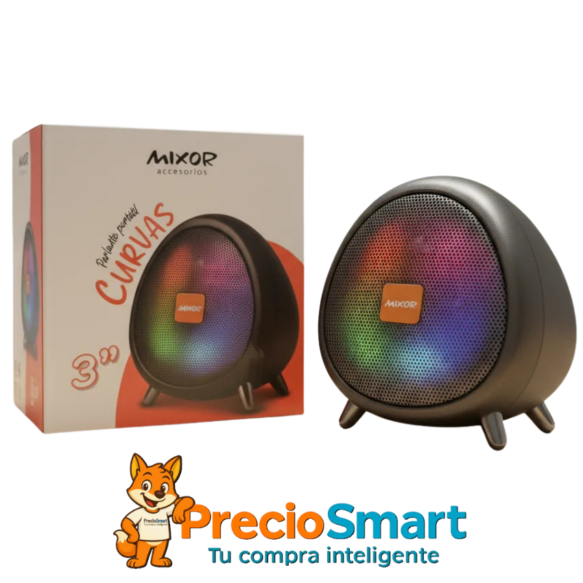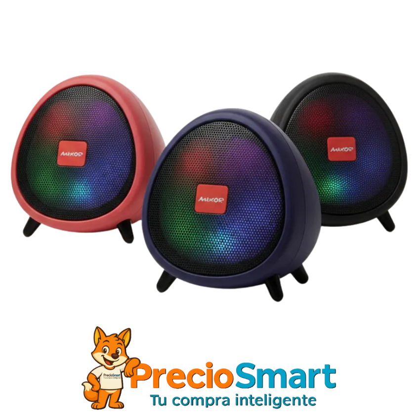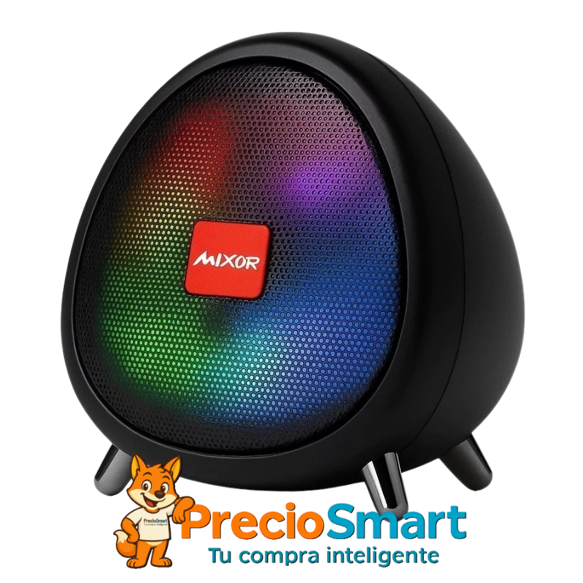 Este parlante marca Mixor con iluminación LED RGB, tiene un diseño compacto y moderno, con una estructura de color negro mate y un logo de la marca en color rojo. El parlante esta equipado con un sistema de luces de colores que genera efectos visuales dinámicos, ideal para agregar un toque de estilo a tu espacio.
