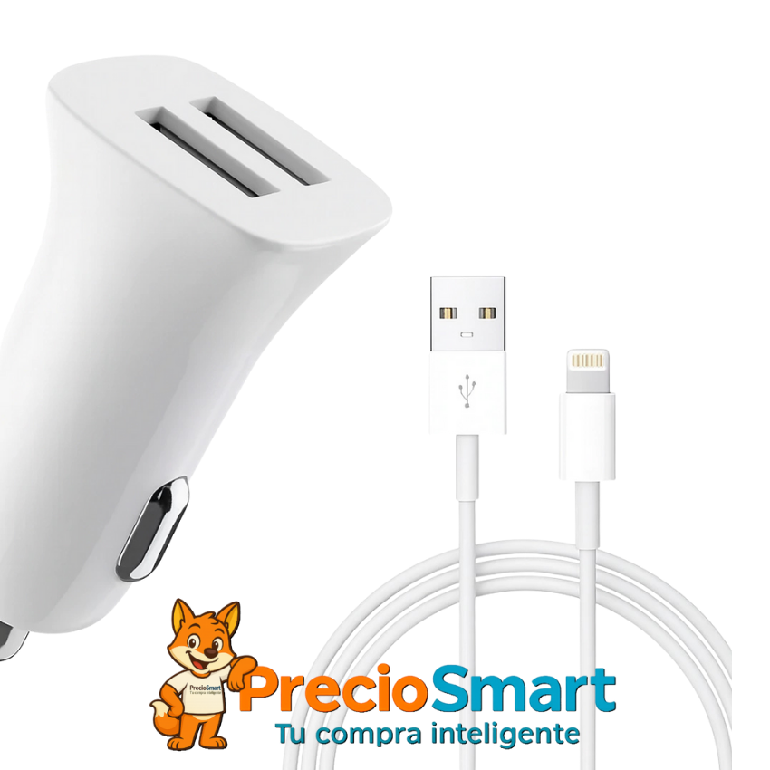 Este cargador para auto de 12V con 2 puertos USB te permite conectar dos dispositivos al mismo tiempo. Viene con cable Lightning incluido, ideal para iPhone, iPad o iPod.